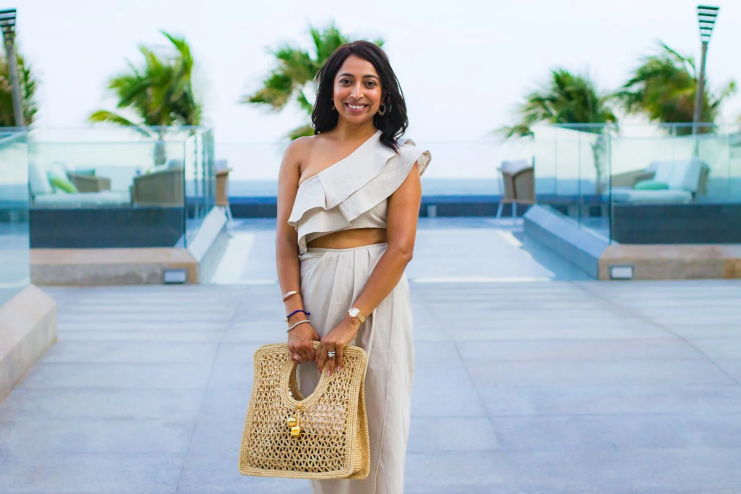 Straw hats and woven bags add texture and neutral tones.